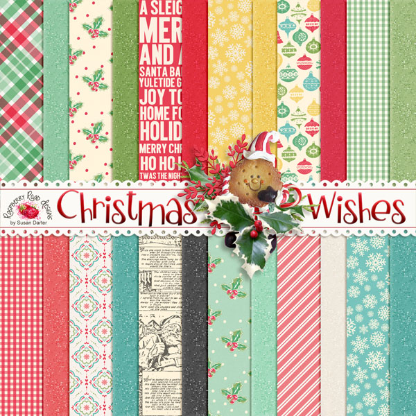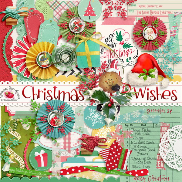 Susan here sharing my newest Christmas collection and of course a free mini kit to match. Christmas Wishes is a fun and festive collection filled with everything you need for any holiday inspired project. I created this collection with children in mind so I wanted something that represented all those fun things about Christmas that we enjoy as kids and the joy a child experiences during the season.