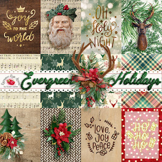 Merry Christmas! Susan here with my new Evergreen Holidays collection for you. This kit honors the beauty of the Christmas tree and the evergreens we use to deck the halls with. Nothing says Christmas like the smell of a fresh cut tree, a scented pine candle or a pile of boughs ready for decorating.